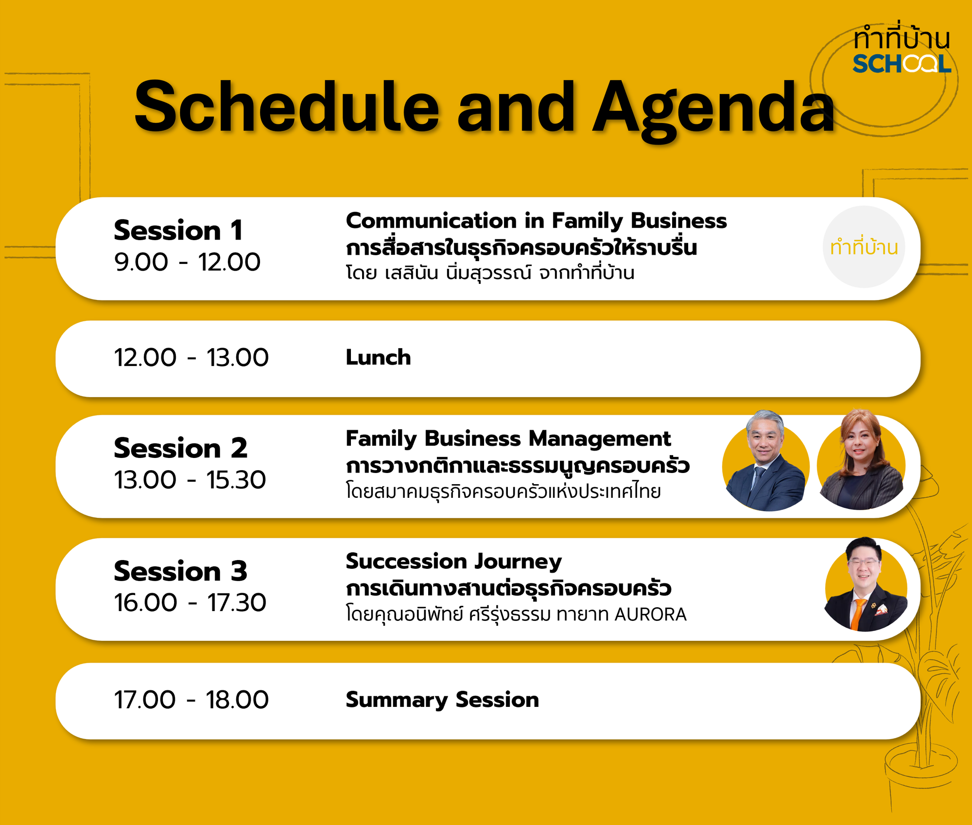 คลาส Family Business Blueprint ออกแบบมาจากปัญหา 'ศึกใน' ธุรกิจครอบครัวที่เกิดขึ้น ร้อยเรียงแต่ละปัญหาเป็นคลาสเรียน 3 Sessions ที่จะชวนทุกคนทำความเข้าใจตั้งแต่การสื่อสารในธุรกิจครอบครัว การออกแบบกฏกติกา การแบ่งบทบาทหน้าที่และผลตอบแทนในธุรกิจครอบครัว เรียนรู้การออกแบบธรรมนูญครอบครัว เครื่องมือที่หลายตระกูลมักนำมาใช้ในการจัดการธุรกิจครอบครัว ไปจนถึงการหาโอกาสใหม่ๆ ให้ธุรกิจครอบครัวจากทายาทที่ผ่านเรื่องราวดังกล่าวได้